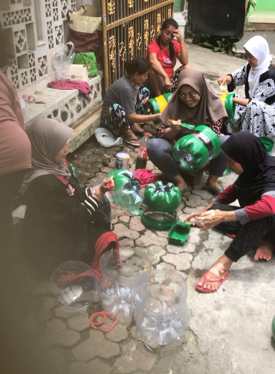 Pembuatan hiasan pot bunga dari galon bekas oleh mahasiswa universitas muhammadiyah malang bersama warga desa joyogrand untuk menghiasi pasar umkm sabtu-minggu di perumahan joyogrand, kota malang, jawa timur.